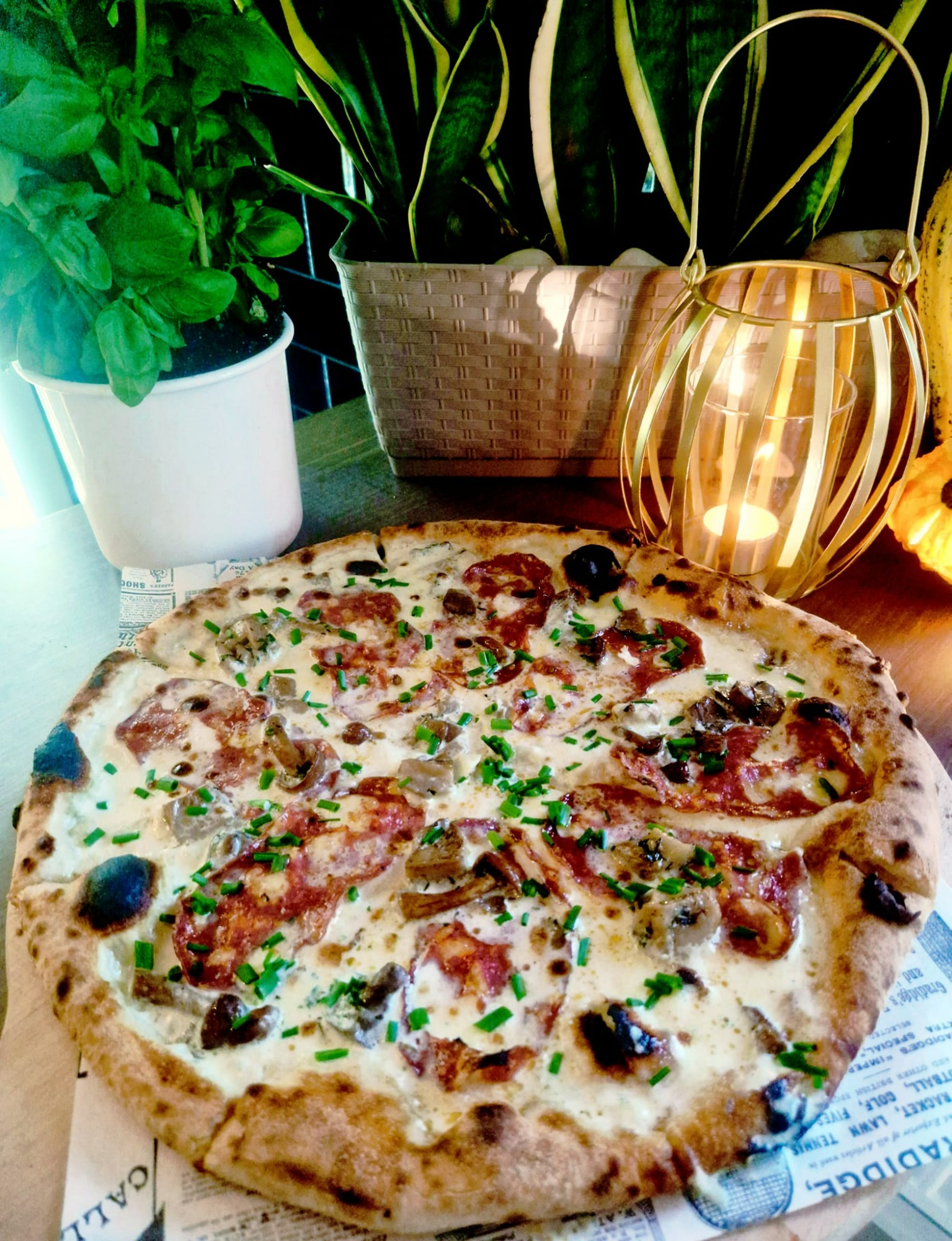sos śmietanowy z Parmigiano Reggiano DOP, mozzarella fior di latte, dojrzewające salami Piccante, czosnek, mieszanka grzybów leśnych, szczypiorek -